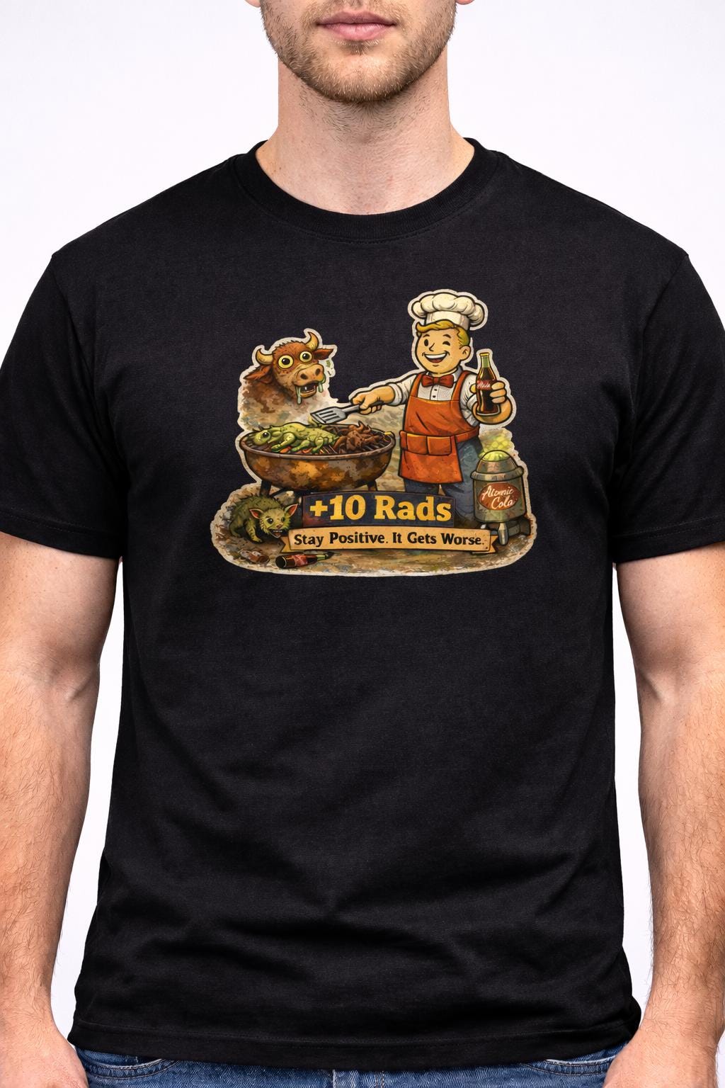 This funny post-apocalyptic T-shirt features an original retro cartoon illustration inspired by 1950s atomic-age artwork and dark humour. With mutated creatures, a cheerful chef, and the sarcastic slogan “Stay Positive. It Gets Worse.” plus “+10 Rads”, this shirt is perfect for gamers, sci-fi fans, and lovers of grim humour.